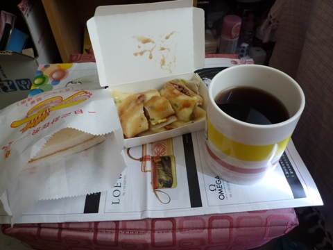 去買了黑豬排蛋餅+花生吐司(薄片)+300cc普洱茶