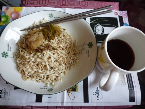 自己煮ㄚ舍乾麵(油蔥辣口味)+房東的愛心苦瓜+200cc普洱茶
