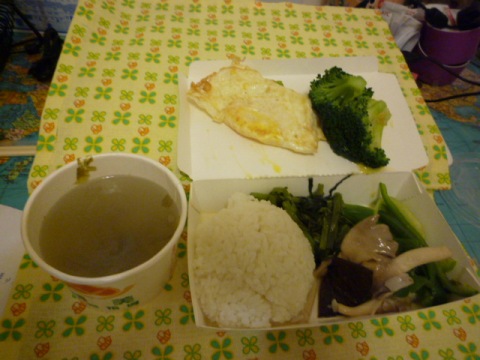 晚餐:清大自助餐 酸菜筍干湯+白飯半碗+綠色花椰菜+炒秀珍菇+炒青椒+空心菜(都各夾一些)+荷包蛋