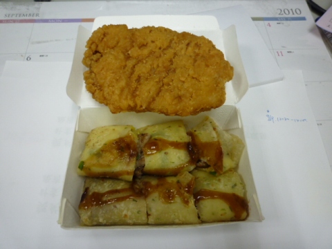早餐:番茄村的溫豆漿+豬排蛋餅+卡拉雞腿